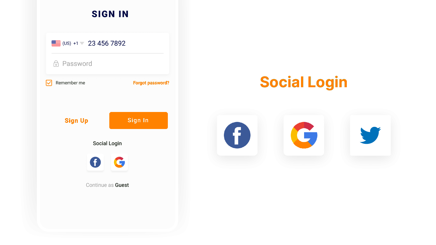 We prioritize your convenience and security. To ensure a smooth onboarding experience, our customer app supports social login functionality. This feature allows you to access your account effortlessly using your existing social media profiles or Gmail address.